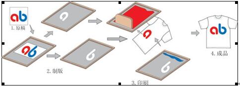 制作流程為,通過刮板的擠壓,使油墨通過圖文部分的網孔轉移到衣物上,制作如下圖: